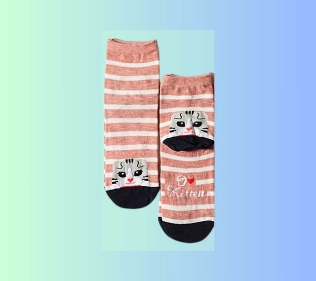 Chaussettes rayées rose et blanc avec mignon Chat au nez en forme de cœur rose chat, à découvrir aussi en rayé gris et blanc et rayé marine et blanc, 100 % polyester tout doux, taille unique.